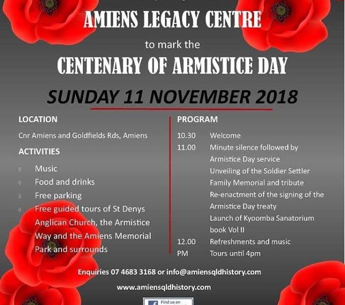 Date(s) – 11/11/2018 9:00 am – 4:00 pm Location Amiens Legacy Centre Cnr Amiens Rd and Goldfields Rds Amiens, Qld, 4380 There will be a re-enactment of